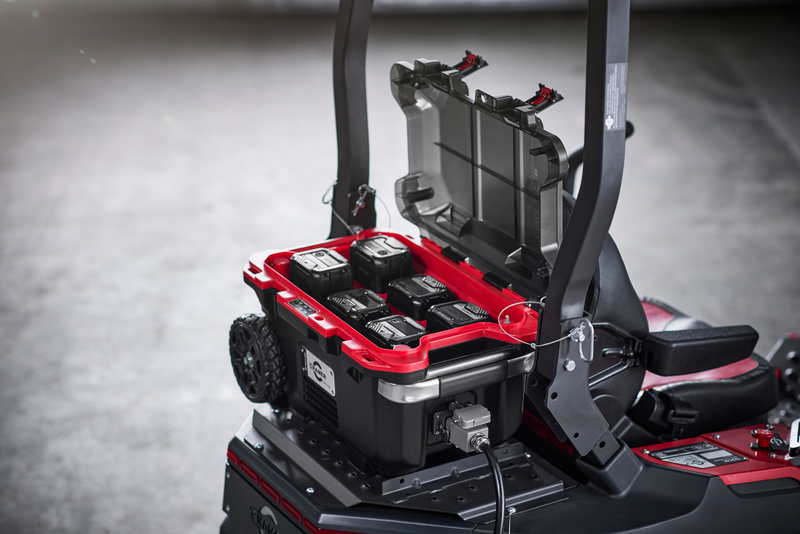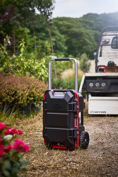 Všestranná mobilní stanice Caddy s velkými koly a výsuvnou rukojetí nabízí snadné řešení pro přepravu i správu vašich baterií.