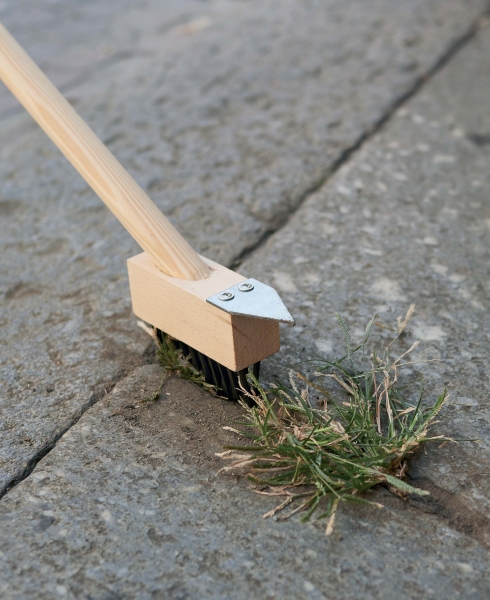 Nástroj na odstraňování plevelů a trávy ze spár ve venkovní zámkové dlažbě.
