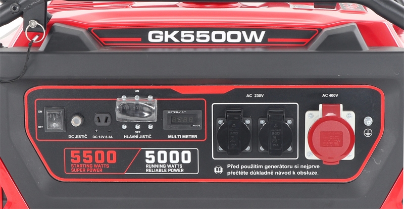 Elektrický výstup: 2x AC 230V/50Hz, 1x 12V DC 8,3A, 1x AC 400 V/50Hz