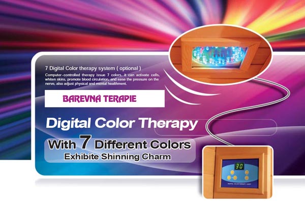 je elektroniky řízená a skládá se ze 7 základních barevných kompozic, při kterých lze efektivně aktivovat lidské smyslové buňky zklidňující kůži, podporující krevní oběh, nebo zmírňující tlak na nervovou soustavu.Barevná terapie má blahodárný vliv na Vaši fiyzickou a duševní rovnováhu. V lékařství se barevná světla uplatňují již delší dobu právě pro zklidňující účinky. Například červená barva zrychluje krevní oběh, transformuje duševní depresi v optimismus. Modrá barva podporuje vstřebávání bílkovin a kolagenu, posiluje kožní buňky, zklidňuje nervy a uvolňuje tělo. Žlutá barva podporuje buňky s okysličovací schopností, aktivuje mikrocirkulaci, regeneraci kůže atd. Zelená barva blahodárně reguluje funkci buněčných žláz, pomáhá při akné atd.