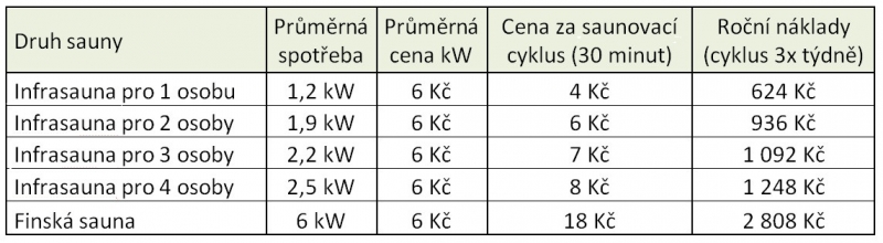 Infrasauny jsou energeticky nenáročné spotřebiče, náklady na energii se pohybují v závislosti na velikosti infrasauny pro každý Váš pobyt v infrasauně okolo 4 - 8 Kč. Záleží na velikosti a kapacitě infrasauny, čím větší infrasauna, tím vyšší výkon potřebuje. Níže naleznete tabulku uvádějící průměrnou spotřebu a přibližnou cenu za saunovací cyklus daného typu infrasauny.