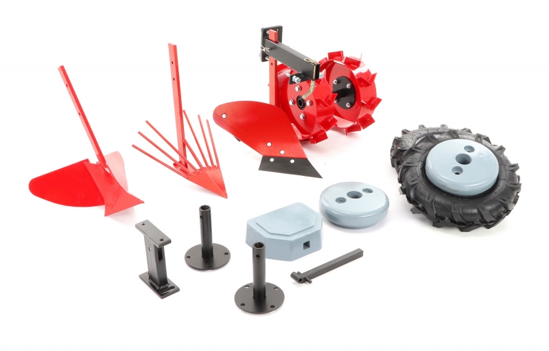 Kompletní velký KIT (šípová kola 400x8 včetně nábojů, kovová kola včetně nábojů, KIT závaží - kolové i přední protizávaží, jednostranný pluh, vyorávač brambor, hrobkovač, závaží a adaptéry)