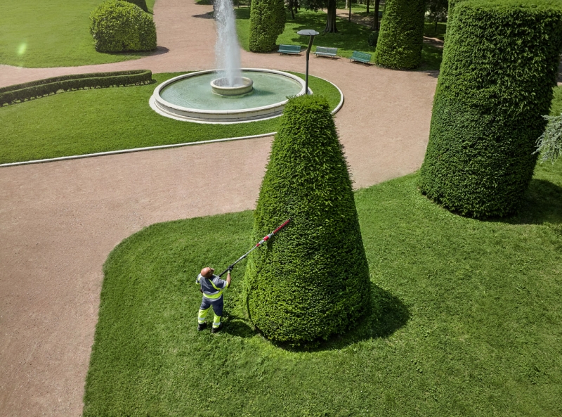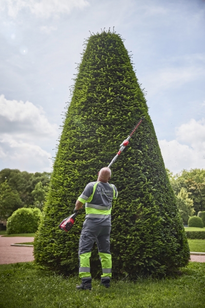 - Pro větší dosah slouží integrovaný zadní nárazník jako přídavná rukojeť při stříhání nejvyšších živých plotů