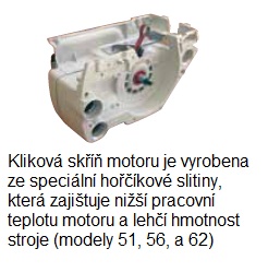 Hřídelová skříň je vyrobena z magnesia (modely 51 – 56 a 62). Magnesium zajišťuje nižší pracovní teplotu motoru a nižší hmotnost stroje.