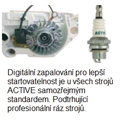 Společnost Active tyto stroje v kubaturách 51, 56 a 62 ccm navíc vybavila klikovou skříní z hořčíkové slitiny, která mnohem lépe odvádí teplo motoru a výrazně prodlužuje životnost motorové pily. Ke standartní výbavě těchto strojů patří digitální zapalování, dekompresní ventil, primer a účinný antivibrační systém. Píst je osazen dvěma pístními kroužky a čep klikový spolu s pístním jsou usazeny na postříbřených jehlových ložiscích. Olejová pumpa mazání řetězu je vyrobena z oceli a umožňuje sežízení toku oleje.