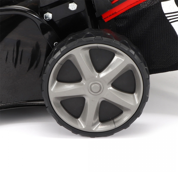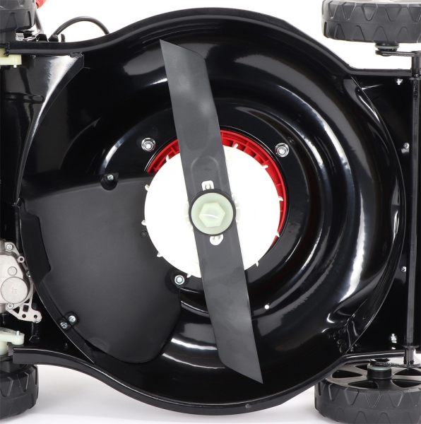Funkce 4v1 umožňuje sběr trávy do koše, mulčování, zadní výhoz a vlastní pojezd což zajišťuje flexibilitu při péči o trávník.