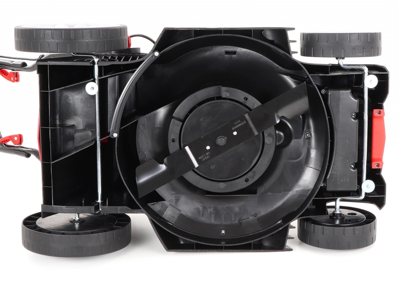 • převod otáček pomocí malého klínového řemene výrazně zvyšuje točivý moment stroje (více síly i v hustší trávě) a při nárazu nože na překážku zabrání spálení motoru a tím pádem i drahé opravě