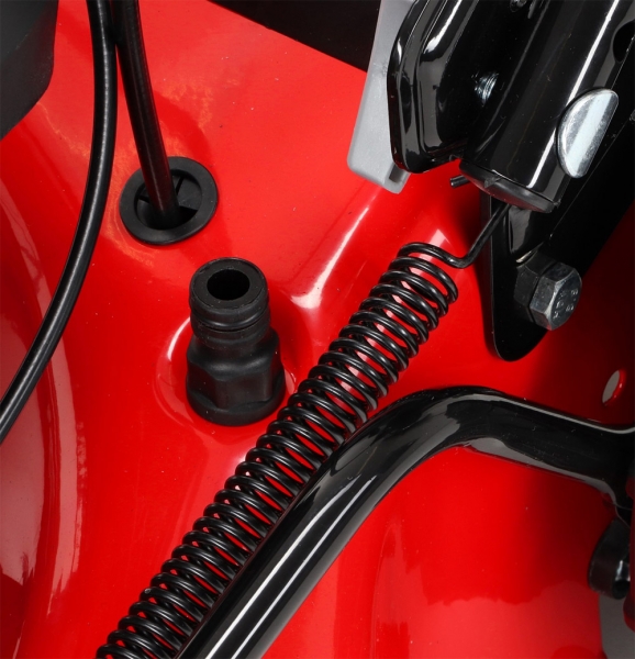 V extrémních podmínkách je možné otevřít kryt na straně šasi a nasadit deflektor bočního výhozu. Je to obzvláště efektivní, pokud máte vysokou, mokrou trávu. Výšku střihu trávníku můžete pohodlně zvolit pomocí samostatné páky centrálního nastavení výšky.