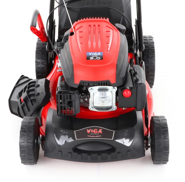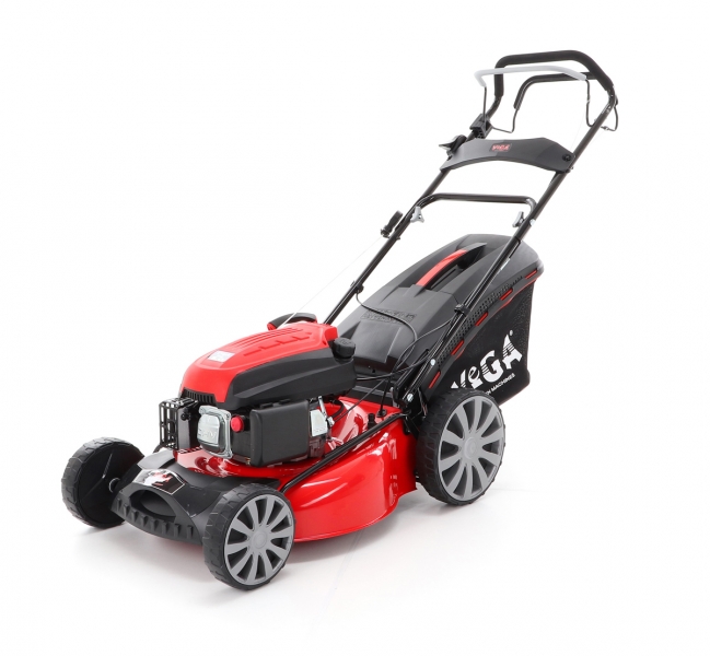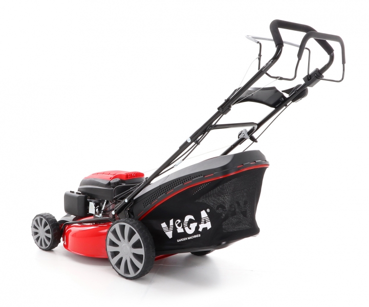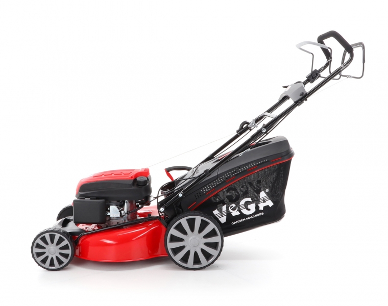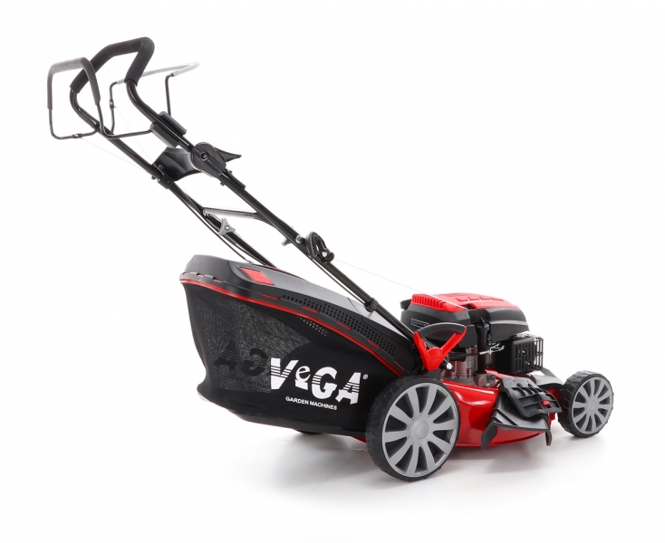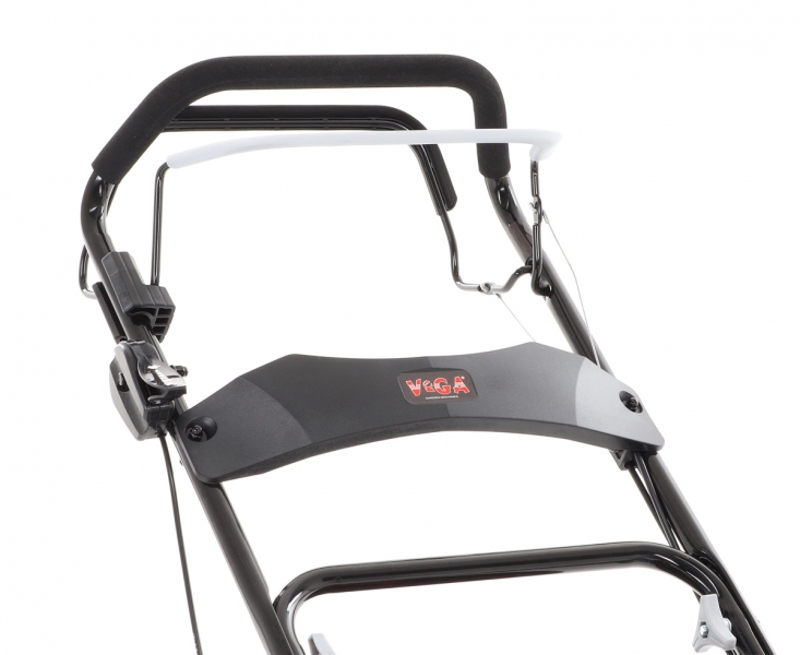 Velká zadní pojezdová kola i přední kola jsou uložena v oboustraných kuličkových ložiscích, centrální nastavení výšky sečení je u značky VeGA také samozřejmostí, jako ergonomické měkčené madlo. Objemný sběrný koš o kapacitě 70 litrů má ukazatel naplnění.