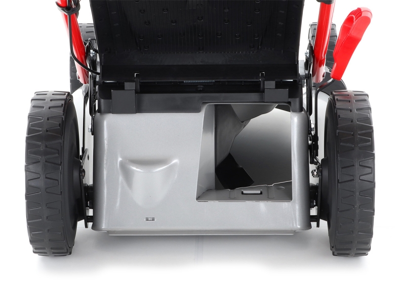 V extrémních podmínkách je možné otevřít kryt na straně šasi a nasadit deflektor bočního výhozu. Je to obzvláště efektivní, pokud máte vysokou, mokrou trávu. Výšku střihu trávníku můžete pohodlně zvolit pomocí samostatné páky centrálního nastavení výšky.