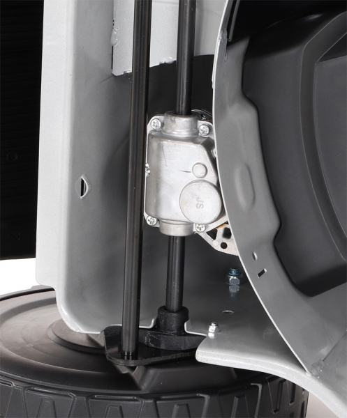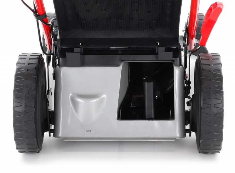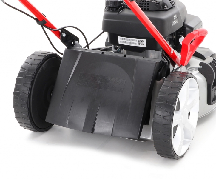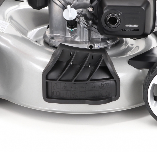 V extrémních podmínkách je možné otevřít kryt na straně šasi a nasadit deflektor bočního výhozu. Je to obzvláště efektivní, pokud máte vysokou, mokrou trávu. Výšku střihu trávníku můžete pohodlně zvolit pomocí samostatné páky centrálního nastavení výšky.