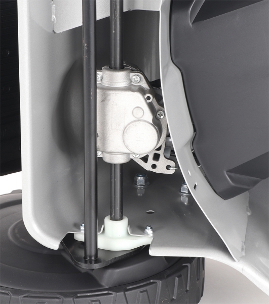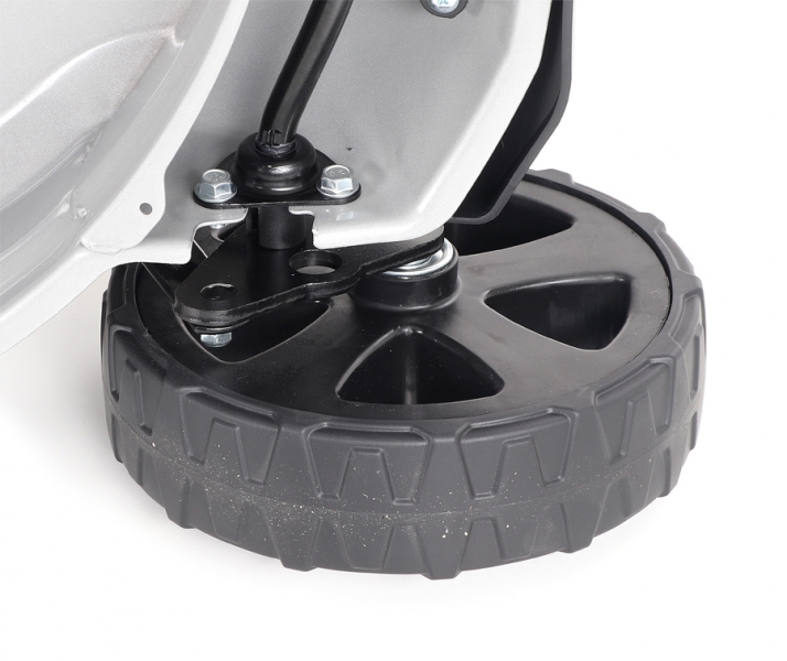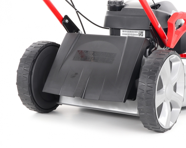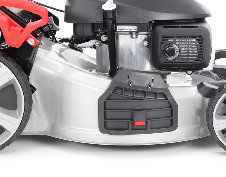 V extrémních podmínkách je možné otevřít kryt na straně šasi a nasadit deflektor bočního výhozu. Je to obzvláště efektivní, pokud máte vysokou, mokrou trávu. Výšku střihu trávníku můžete pohodlně zvolit pomocí samostatné páky centrálního nastavení výšky.