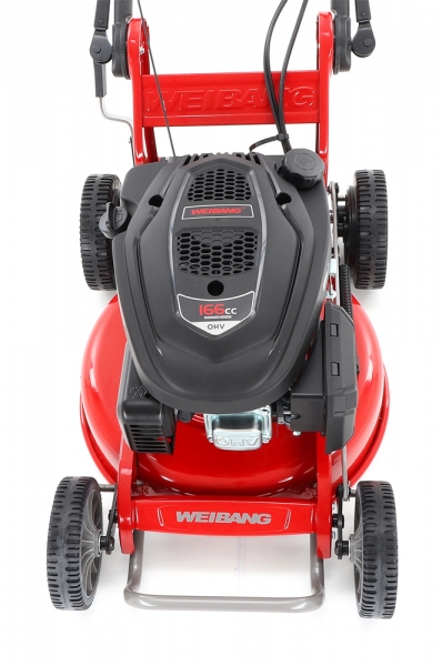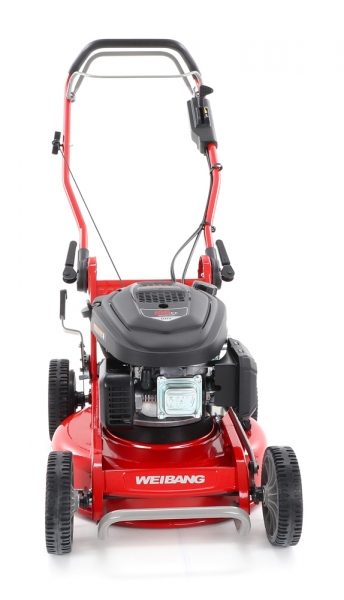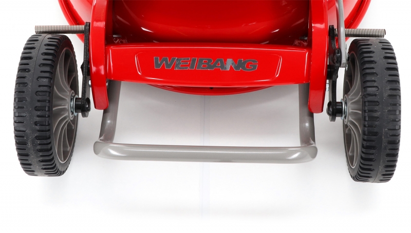 Sekačka WEIBANG WB 466 SCM je určena na středně velké travnaté plochy. Sekačka je především určena pro domácí i profesionální mulčování s pojezdem. Sekačka WEIBANG WB 466 SCM vyniká speciálně tvarovaným pevným a masivním ocelovým šasim a je také vybavena variabilním pojezd daným otáčkama motoru. Výhoda silného motoru o výkonu 6 HP a speciálnlně tvarovaného silného mulčovacího nože Vám perfektně poseká nízkou i středně vysokou trávu. Pogumovaná sendvičová kola jsou uložena v oboustranných kuličkových ložiscích, centrální nastavení výšky sečení je u této značky samozřejmostí. Velkým nadstandardem u této sekačky je použita speciální PROFI ochrana hřídele motoru, která je schopna zabránit poškození celého motoru. Tato funkce může eliminovat škody na sekačce způsobené nárazem nože do překážky. Dále je tato sekačka vybavena pevnými zadními koly a sklopnou rukojetí pro snadné uskladnění a přepravu. Dalším velkým unikátem je motor, který patří mezi silné motory, co WEIBANG v této třídě nabízí. Jedná se o silný motor rozvodu OHV o výkonu 6 HP a vysokým kroutícím momentem 9,5 Nm - 166 ccm. Další profesionální prvek, kterým sekačka disponuje je masivní kovová převodovka s garantovanou dlouhou životností. Novinkou sekačky je funkce tzv. "CHYTRÉ ŘEŠENÍ", sekačku lze pro ekonomické uskladnění, snadné čištění, servisování otočit a postavit na zadní speciální patky šasí, tímto se snadno dostanete na spodní část žacího ústrojí, uložení náprav a převodovku. Ergonomicky upravená madla se dají variabilně nastavit do jakékoli výšky za pomocí profesionálních masivních celokovových rychloupínáků. Speciální metalický komaxitový nástřik SMOOTH HARDNESS (3 vrstvy nástřiku), který výrazně umocňuje luxusní vzhled a eleganci.