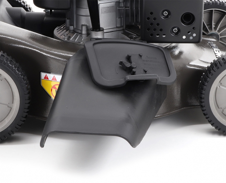 V extrémních podmínkách je možné otevřít kryt na straně šasi a nasadit deflektor bočního výhozu. Je to obzvláště efektivní, pokud máte vysokou, mokrou trávu. Výšku střihu trávníku můžete pohodlně zvolit pomocí samostatné páky centrálního nastavení výšky.