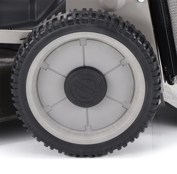 Velká pogumovaná sendvičová kola jsou uložena v oboustranných kuličkových ložiscích, což zajišťuje snadný a hladký pohyb i v náročném terénu. Kola zároveň tlumí nárazy a přispívají ke stabilitě během sečení.