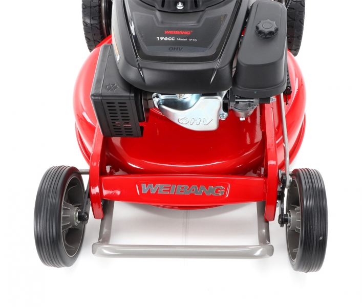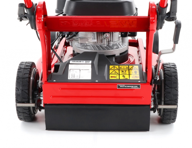 Sekačka WEIBANG WB 537 SCM je určena na středně velké až velké travnaté plochy. Sekačka je především určena pro domácí i profesionální mulčování s pojezdem. Sekačka WEIBANG WB 537 SCM vyniká speciálně tvarovaným pevným a masivním ocelovým šasim a je také vybavena variabilním pojezd daným otáčkama motoru. Výhoda hodně silného motoru o výkonu 7 HP a speciálnlně tvarovaného silného mulčovacího nože Vám perfektně poseká nízkou i středně vysokou trávu. Pogumovaná sendvičová kola jsou uložena v oboustranných kuličkových ložiscích, centrální nastavení výšky sečení je u této značky samozřejmostí. Velkým nadstandardem u této sekačky je použita speciální PROFI ochrana hřídele motoru, která je schopna zabránit poškození celého motoru. Tato funkce může eliminovat škody na sekačce způsobené nárazem nože do překážky. Dále je tato sekačka vybavena pevnými zadními koly a sklopnou rukojetí pro snadné uskladnění a přepravu. Dalším velkým unikátem je motor, který patří mezi to nejlepší a nejsilnější co WEIBANG v této třídě nabízí. Jedná se o profesionální hodně silný motor rozvodu OHV o výkonu 7 HP a vysokým kroutícím momentem 10,5 Nm - 196 ccm. Další profesionální prvek, kterým sekačka disponuje je masivní kovová převodovka s garantovanou dlouhou životností. Novinkou sekačky je funkce tzv. "CHYTRÉ ŘEŠENÍ", sekačku lze pro ekonomické uskladnění, snadné čištění, servisování otočit a postavit na zadní speciální patky šasí, tímto se snadno dostanete na spodní část žacího ústrojí, uložení náprav a převodovku. Ergonomicky upravená madla se dají variabilně nastavit do jakékoli výšky za pomocí profesionálních masivních celokovových rychloupínáků. Speciální metalický komaxitový nástřik SMOOTH HARDNESS, který výrazně umocňuje luxusní vzhled a eleganci.
