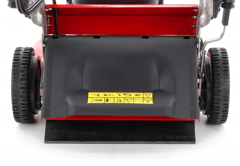V extrémních podmínkách je možné otevřít kryt na straně šasi a nasadit deflektor bočního výhozu. Je to obzvláště efektivní, pokud máte vysokou, mokrou trávu. Výšku střihu trávníku můžete pohodlně zvolit pomocí samostatné páky centrálního nastavení výšky.