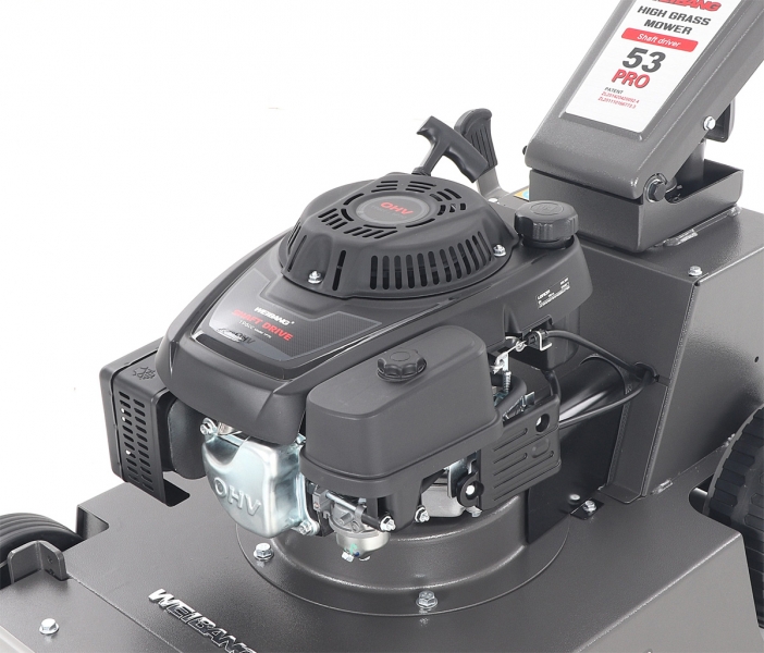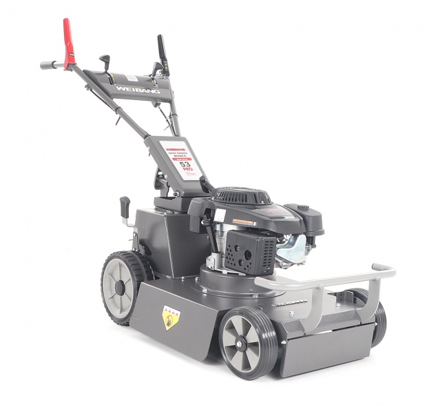 Sekačka WEIBANG WB BC 537 SCV je určena na středně velké až velké travnaté plochy. Sekačka je především určena pro domácí i profesionální mulčování s pojezdem. Sekačka WEIBANG WB BC 537 SCV vyniká speciálně tvarovaným pevným a masivním ocelovým šasim a je také vybavena 3 rychlostní převodovkou. Výhoda hodně silného motoru 196 ccm a speciálnlně tvarovaného silného mulčovacího X nože Vám perfektně poseká nízkou i středně vysokou trávu. Pogumovaná sendvičová kola jsou uložena v oboustranných kuličkových ložiscích, centrální nastavení výšky sečení je u této značky samozřejmostí. Velkým nadstandardem u této sekačky je použita speciální PROFI ochrana hřídele motoru, která je schopna zabránit poškození celého motoru. Tato funkce může eliminovat škody na sekačce způsobené nárazem nože do překážky. Dále je tato sekačka vybavena pevnými zadními koly a sklopnou rukojetí pro snadné uskladnění a přepravu. Dalším velkým unikátem je motor, který patří mezi to nejlepší a nejsilnější co WEIBANG v této třídě nabízí. Jedná se o profesionální hodně silný motor rozvodu OHV s vysokým kroutícím momentem 10,5 Nm - 196 ccm.