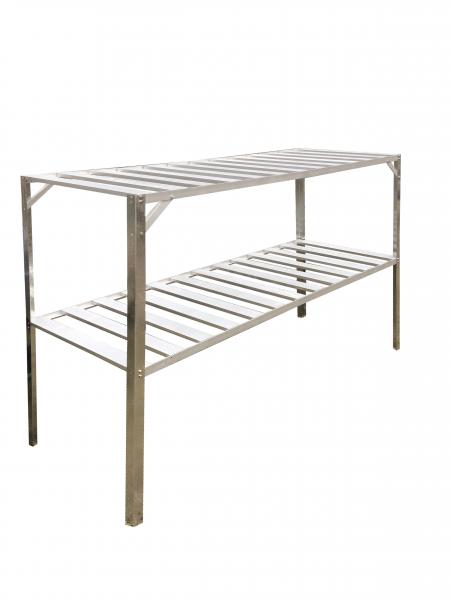 AL regál dvoupolicový stojící na zemi. Rozměry regálu jsou 1260 x 500 x 750 mm (d x š x v).