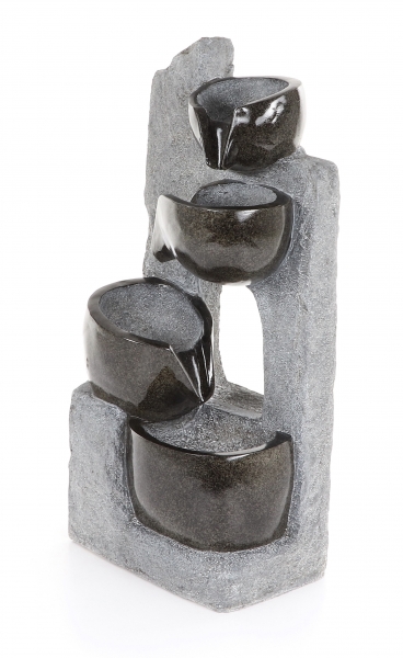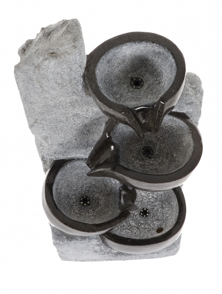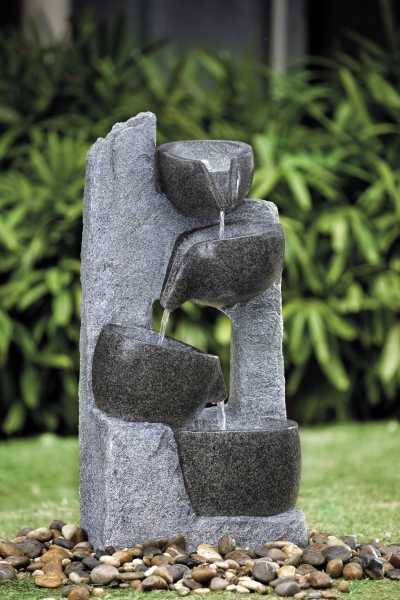 . Zahradní fontána s přelévajícími se kamennými miskami s LED osvětlením bude rozhodně příjemnou oázou klidu a pohody ve Vaší zahradě. Zahradní fontána je vybavena kvalitní a velmi tichou vodní pumpou. Voda stéká po jednotlivých miskách, misky jsou prosvětleny LED osvětlením. Fontána vytváří romantickou atmosféru a světlo z vodní hladiny upoutává zvýšenou pozornost a navozuje velmi příjemnou atmosféru. V teplých dnech je mimořádně kouzelná ve večerních hodinách.