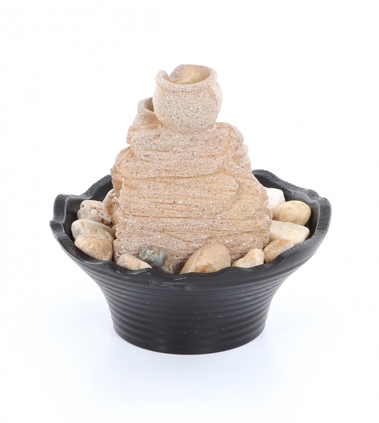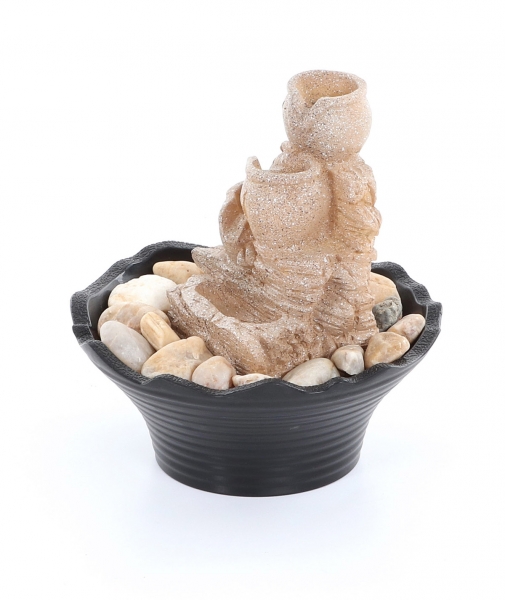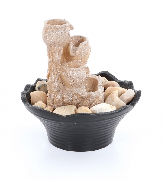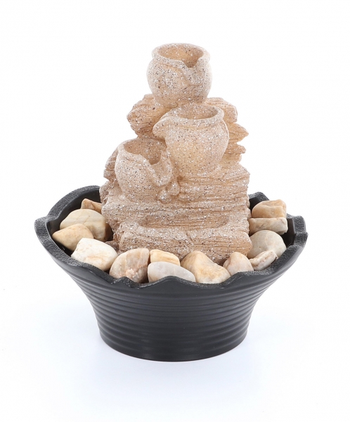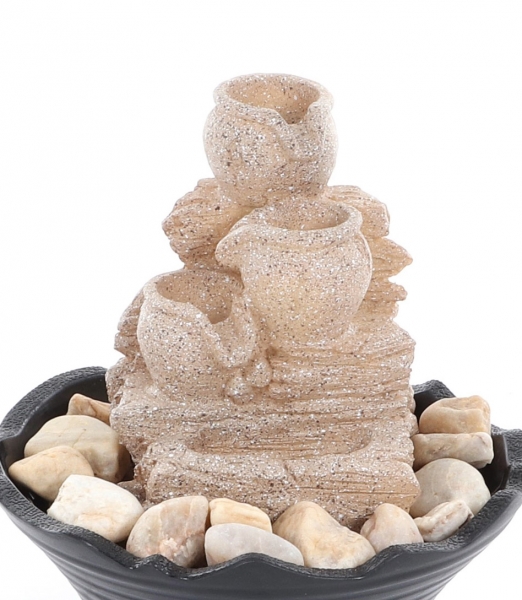 Pokojová fontána vyobrazující přelévající se džbánky s LED osvětlením bude rozhodně příjemnou oázou klidu, pohody ve Vašem bytě. Pokojová fontána je vybavena kvalitní a velmi tichou vodní pumpou. Voda stéká po jednotlivých džbánkách, spodní studánka je prosvětlena LED osvětlením. Fontána vytváří romantickou atmosféru a navozuje velmi příjemnou pohodu a relax spojený s osvěžující ionizací vzduchu.