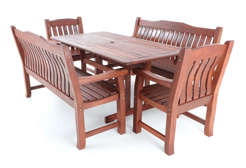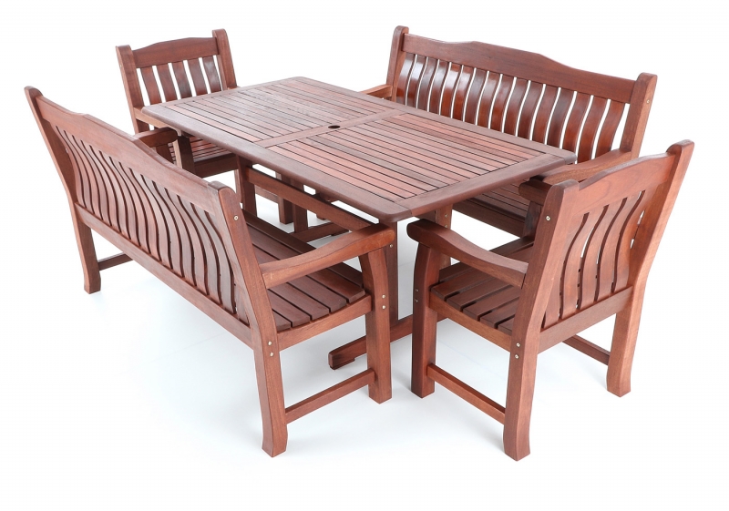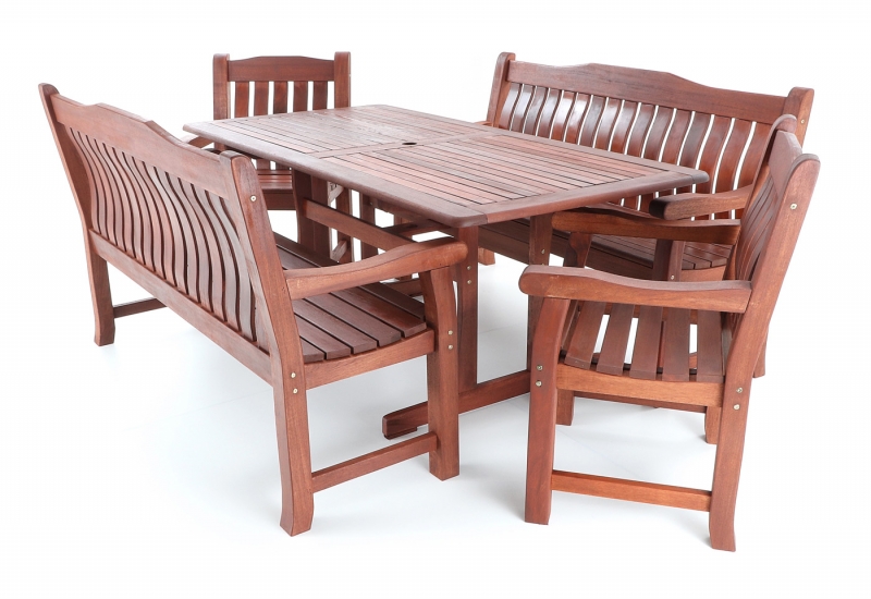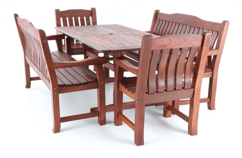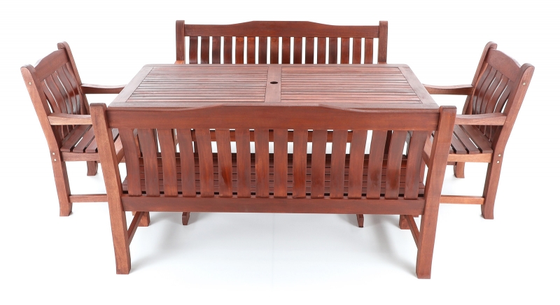 Luxusní masivní stolová sestava dvou křesel, dvou lavic a stolu z exotického, velice trvanlivého a tvrdého dřeva MERANTI. Dřevo o neuvěřitelné síle a velmi robustní konstrukce řadí tuto sestavu mezi nejmasivnějších výrobky ve své kategorii na trhu.