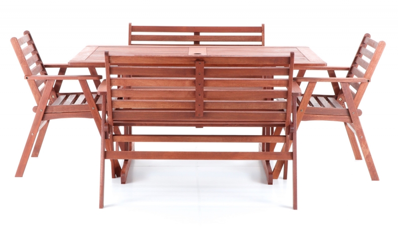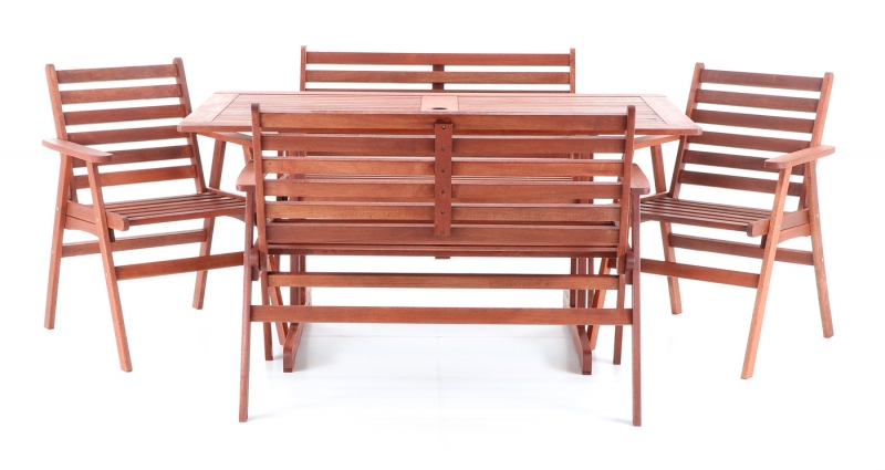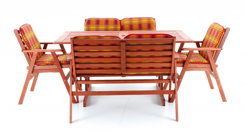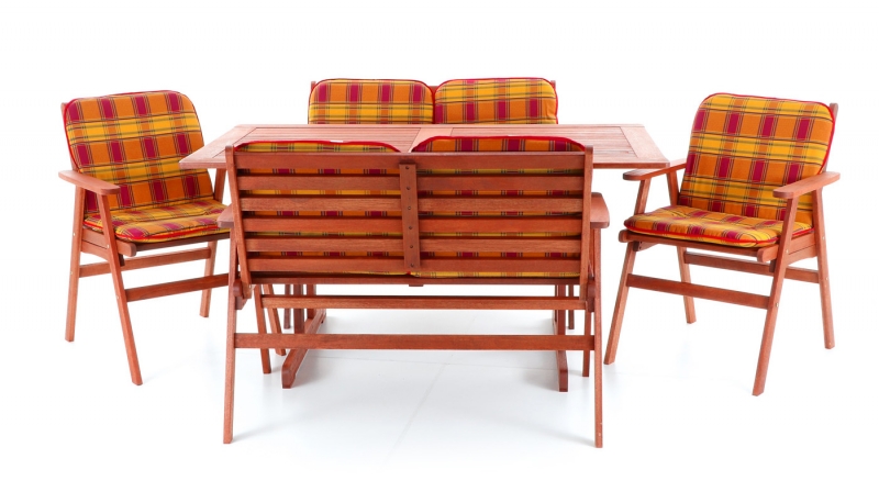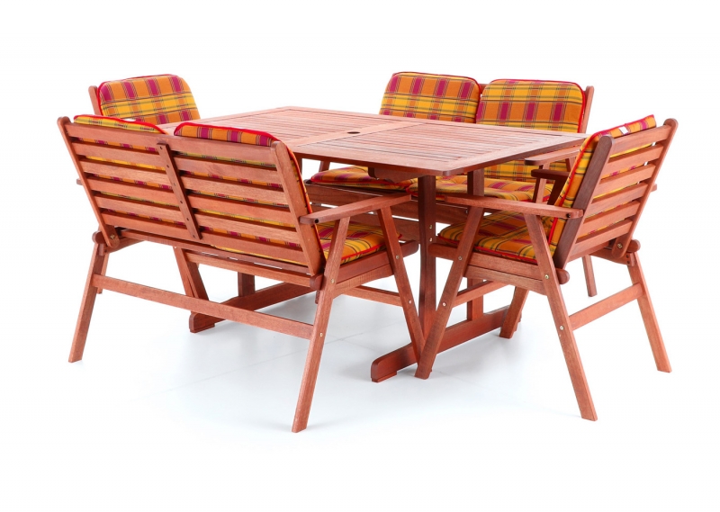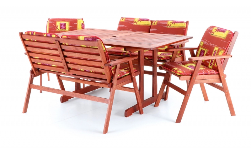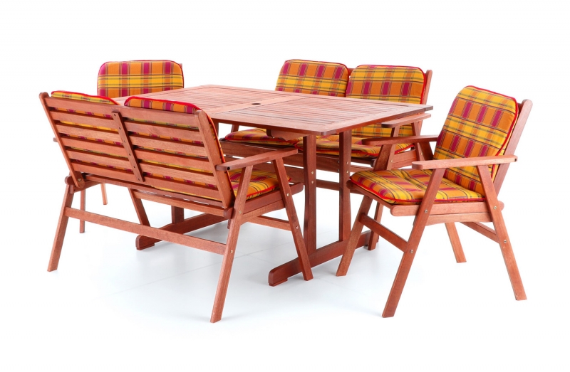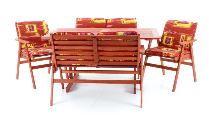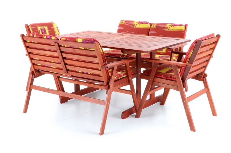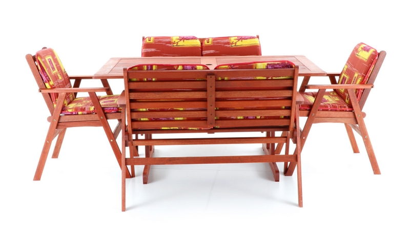 Luxusní masivní stolová sestava 2x křesel, 2x lavic a stoluz exotického, velice trvanlivého a tvrdého dřeva meranti. Určeno do exteriérů, interiérů a pergolových prostor. Možno přiobjednat masivní podsedáky (tloušťka 6 cm) viz. ilustrační obrázek. Rozměry stolu: 150 x 90 x 74 cm. Rozměr křesla: 59 x 63 x 86 cm.rozměr lavice 120x63x86 cm