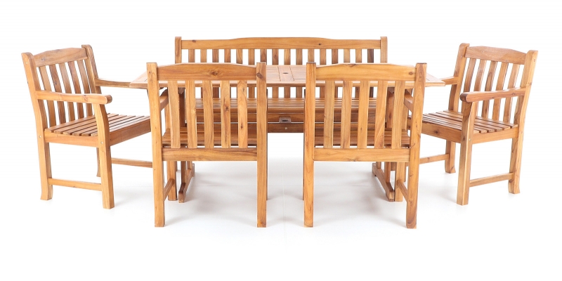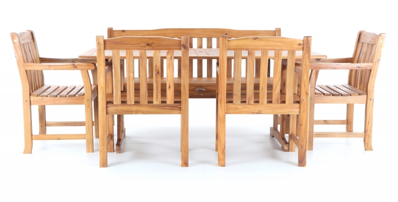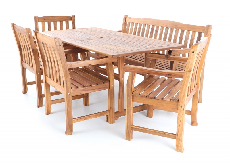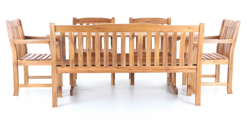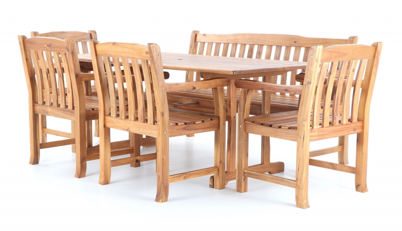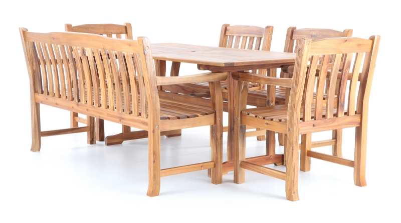 Luxusní masivní stolová sestava čtyř křesel, jedné lavice a stolu z exotického, velice trvanlivého a tvrdého dřeva AKÁCIE. Dřevo o neuvěřitelné síle a velmi robustní konstrukce řadí tuto sestavu mezi nejmasivnějších výrobky ve své kategorii na trhu.
