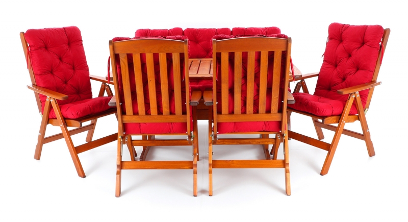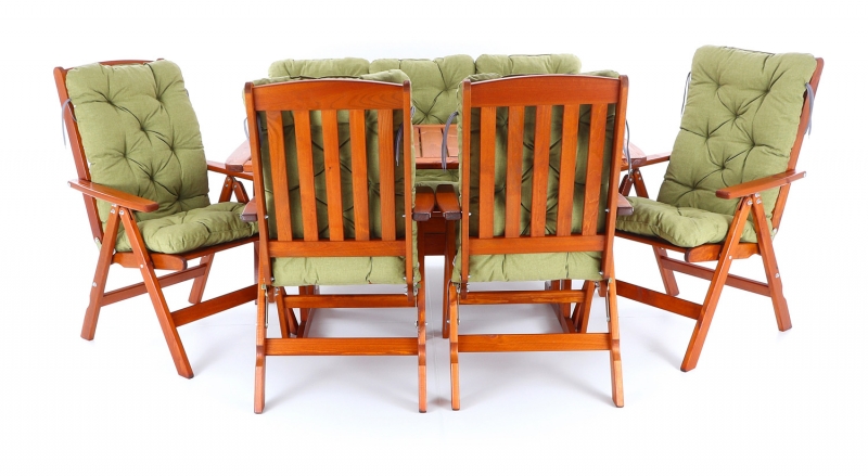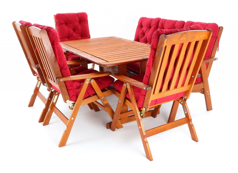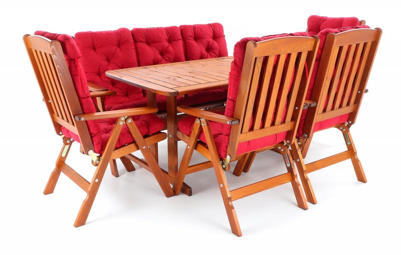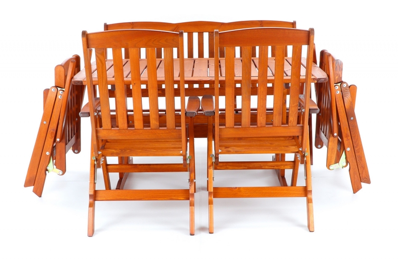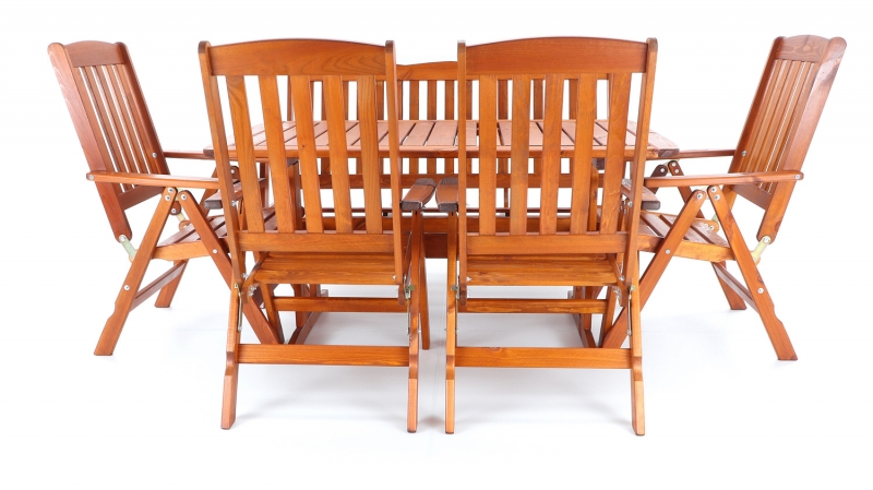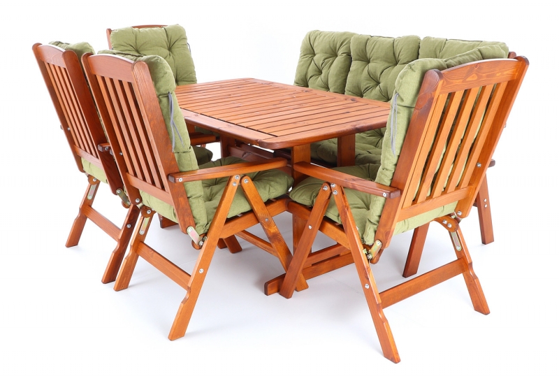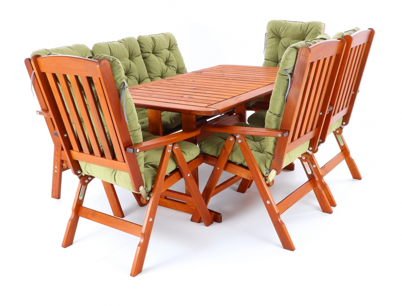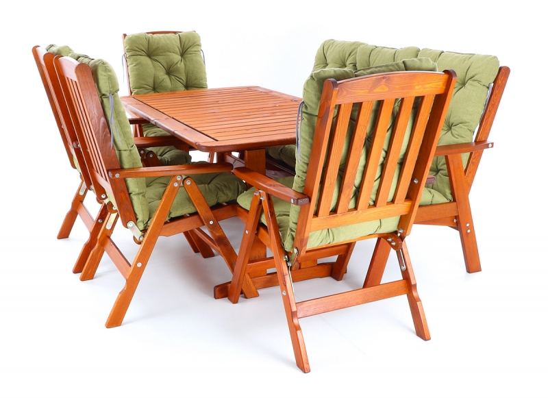Luxusní masivní stolová sestava čtyř polohovacích křesel, jedné polohovací lavice a stolu z odolného a trvanlivého dřeva severské borovice.Odolné dřevo a velmi robustní konstrukce řadí tuto sestavu mezi nejmasivnější výrobky ve své kategorii na trhu.