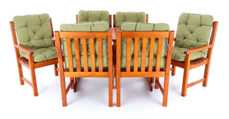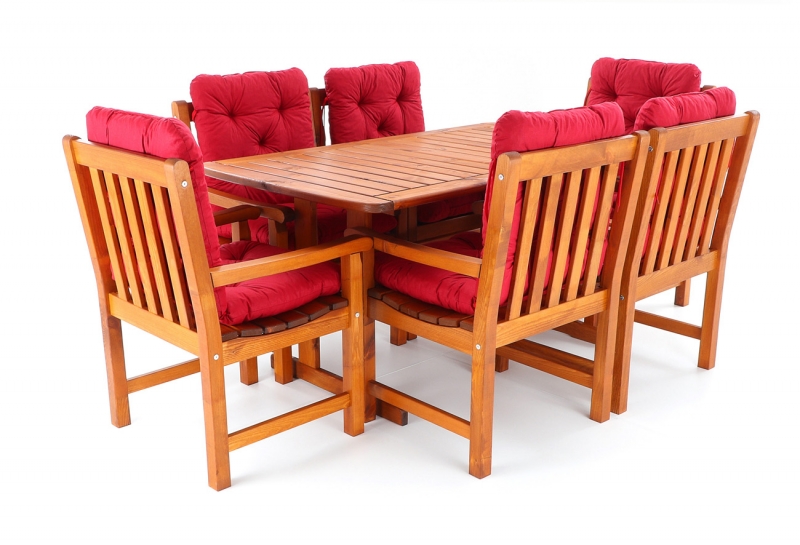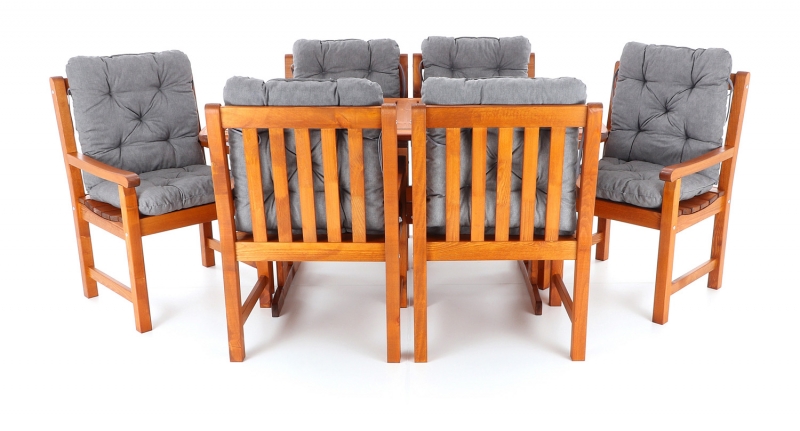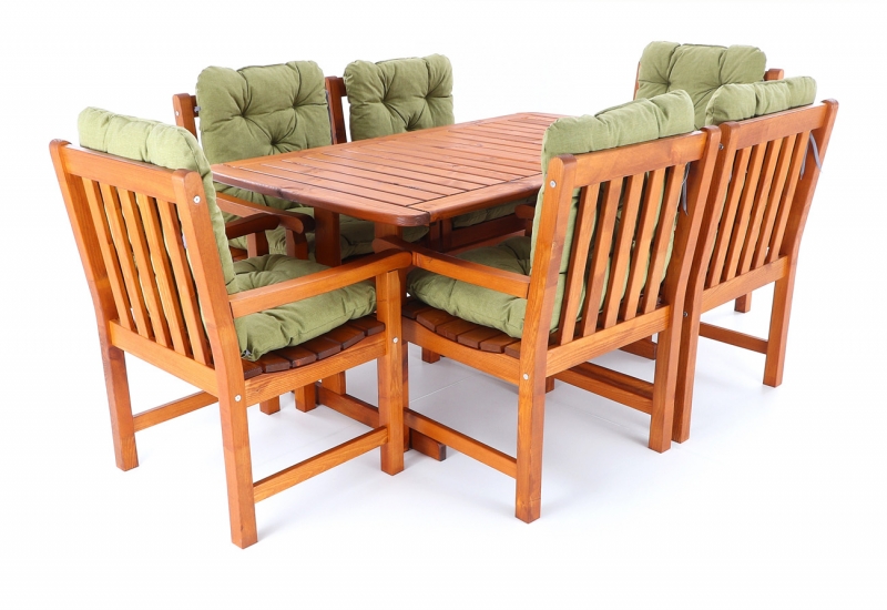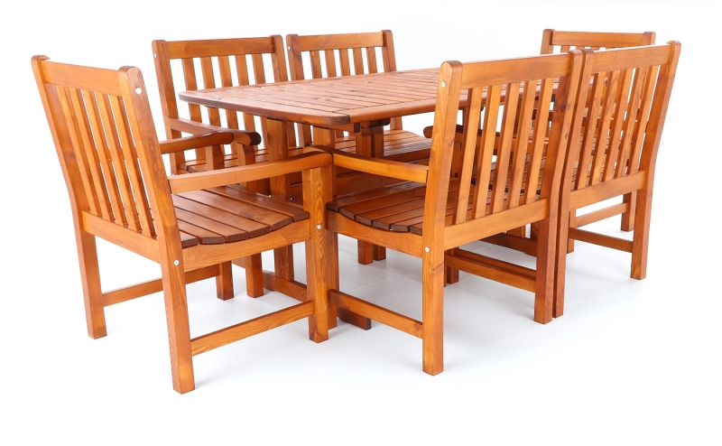 Luxusní masivní stolová sestava šesti křesel a stolu z odolného a trvanlivého dřeva severské borovice. Odolné dřevo a velmi robustní konstrukce řadí tuto sestavu mezi nejmasivnější výrobky ve své kategorii na trhu.
