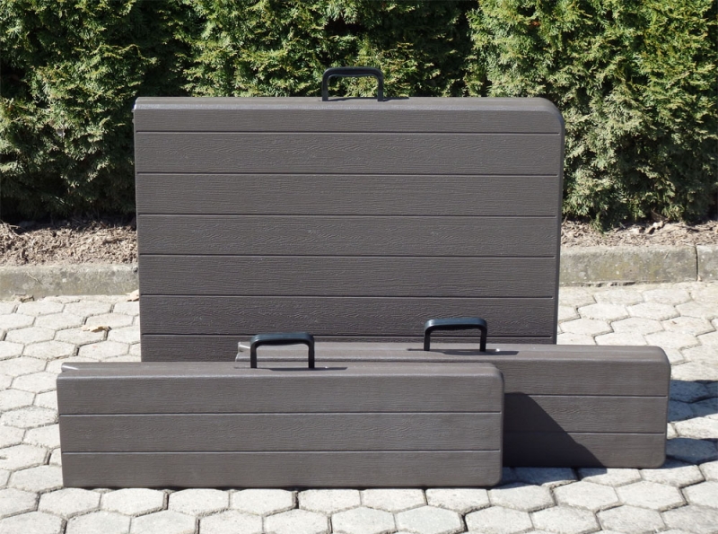 Skládací stůl je zhotoven z ocelových profilů povrchově dokončen komaxitovou barvou, deska stolu je v imitaci masivního dřeva z lisovaného plastu s UV filtrem.