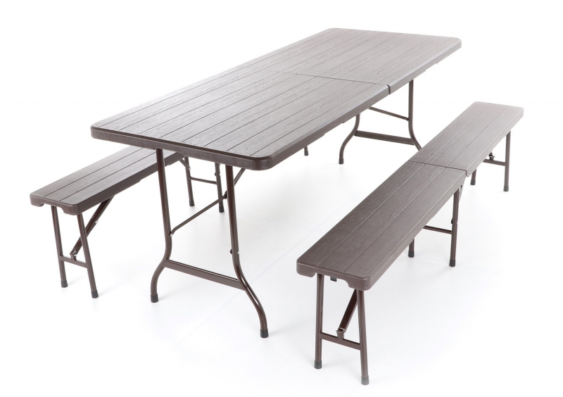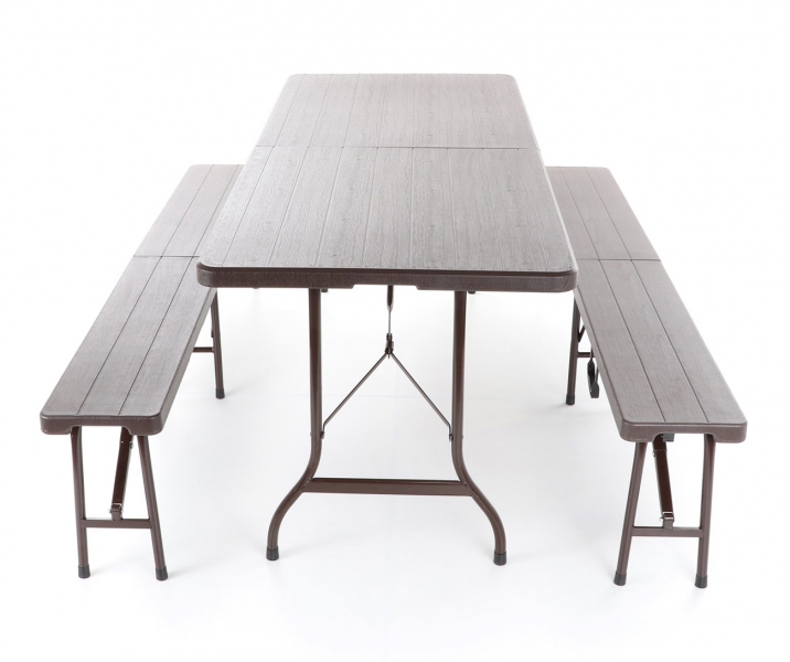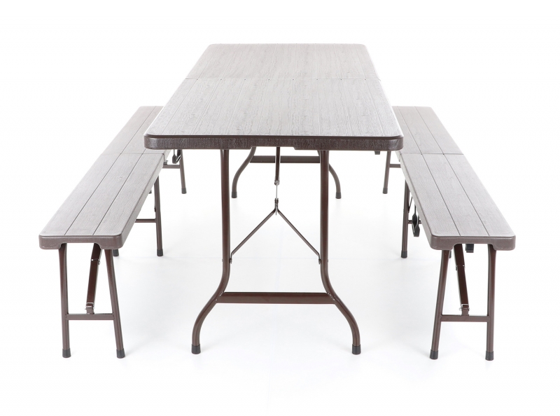 Stolová sestava 2-skládacích lavic z ocelových profilů, povrchově dokončena komaxitovou barvou, čalounění je v imitaci masivního dřeva z lisovaného plastu s UV filtrem.