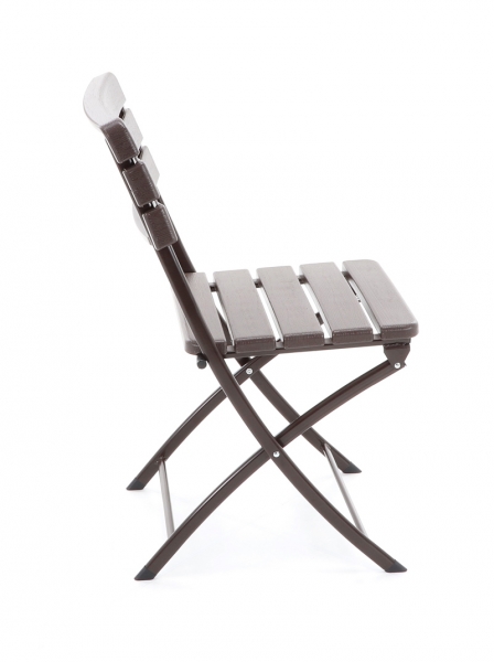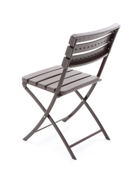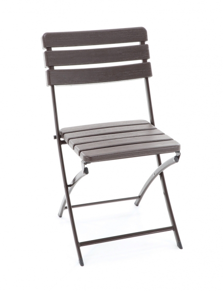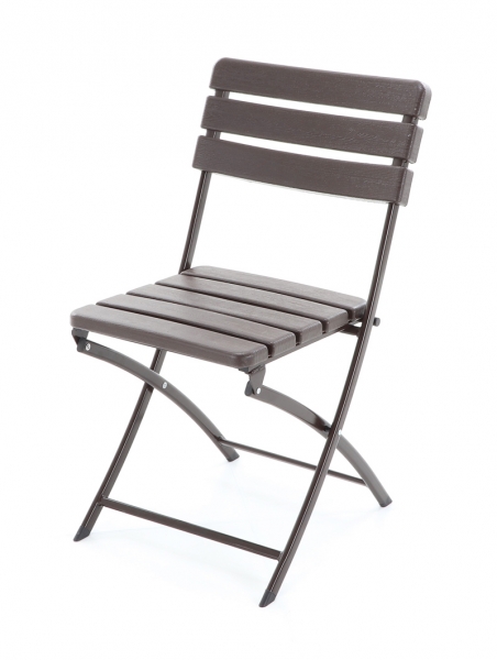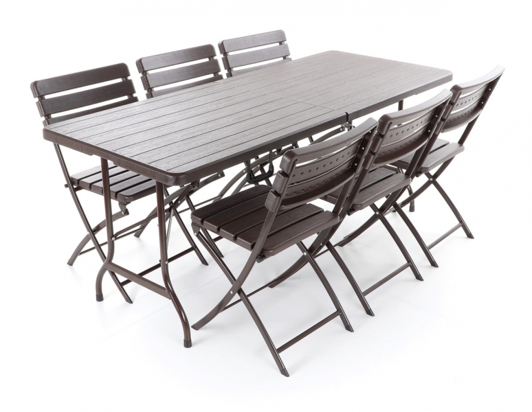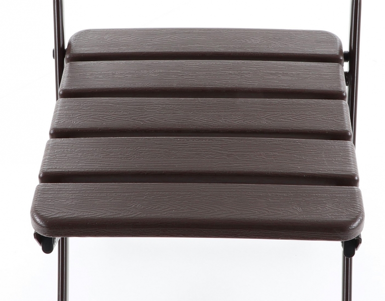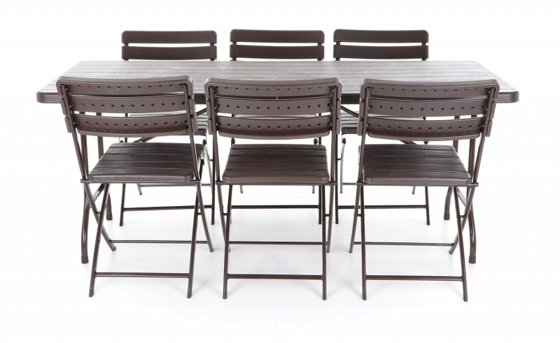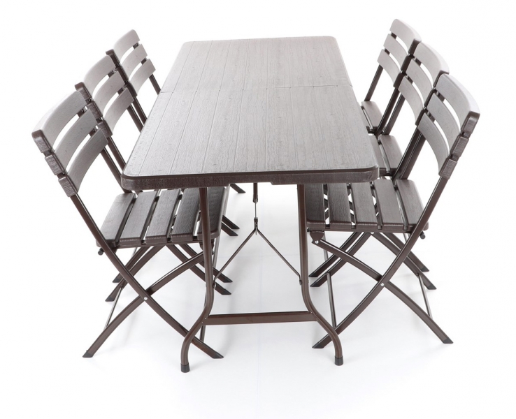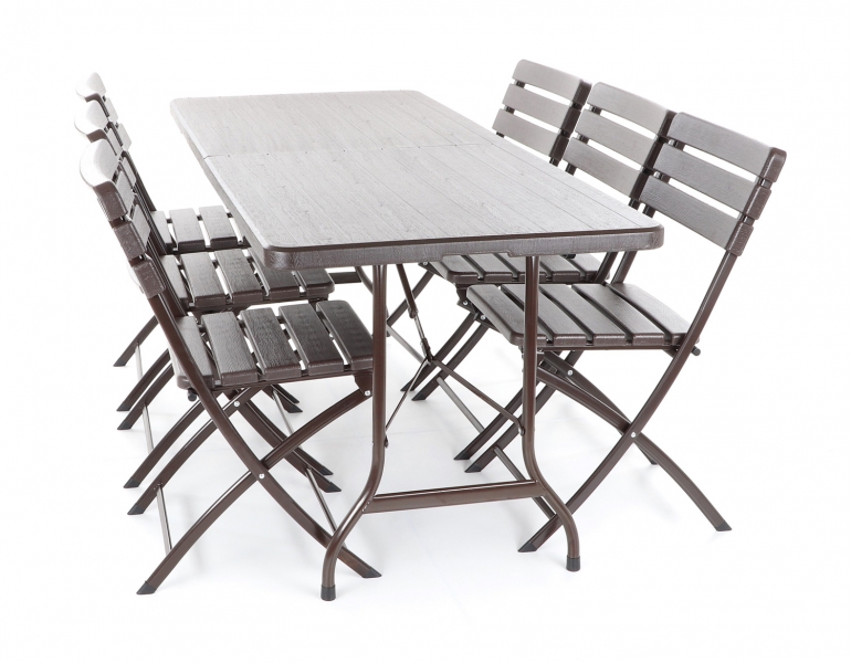 Stolová sestava 6-ti skládacích židlí z ocelových profilů, povrchově dokončena komaxitovou barvou, čalounění je v imitaci masivního dřeva z lisovaného plastu s UV filtrem.