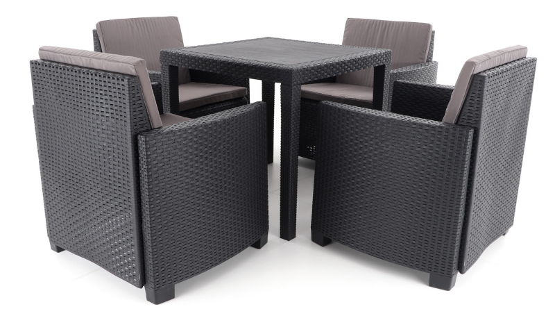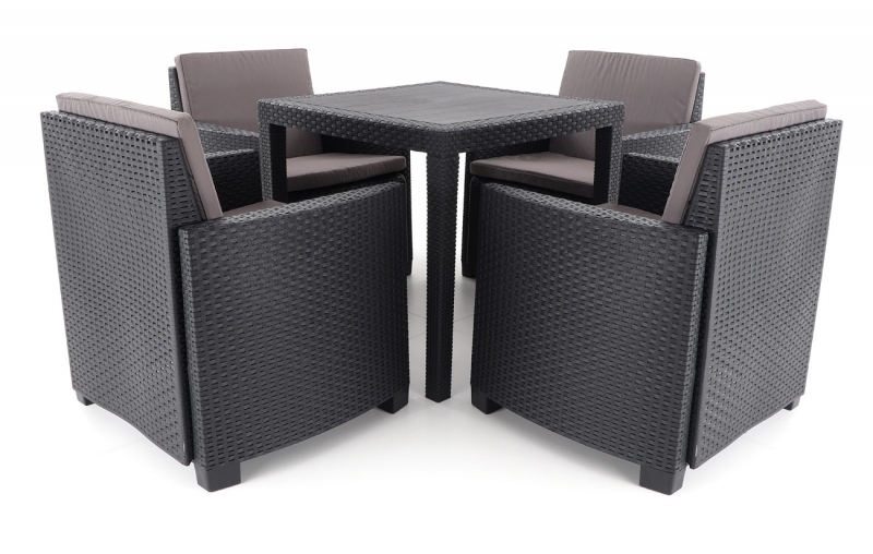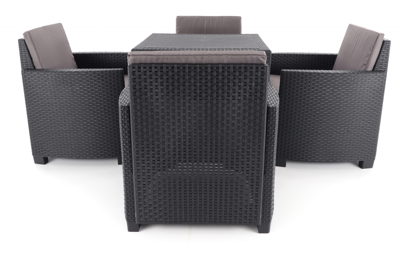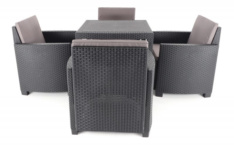 Stolová sestava se skládá ze 4 pohodlných křesel a stolu vimitaci umělého ratanu s UV filtrem