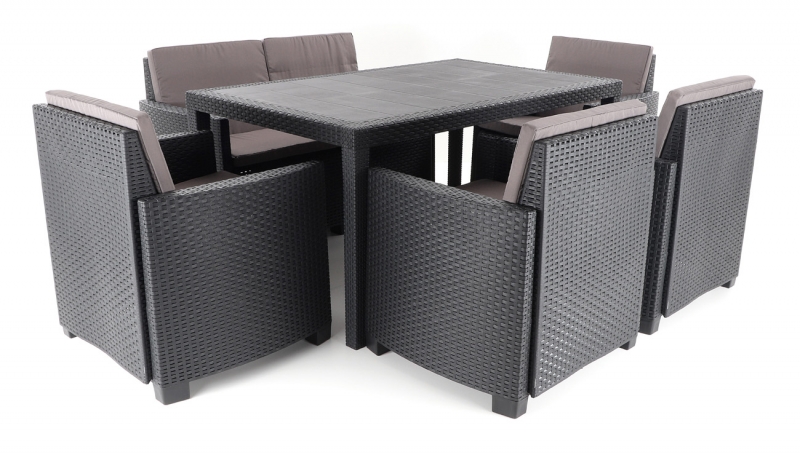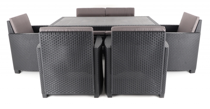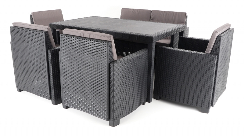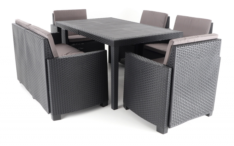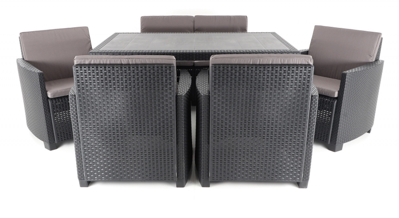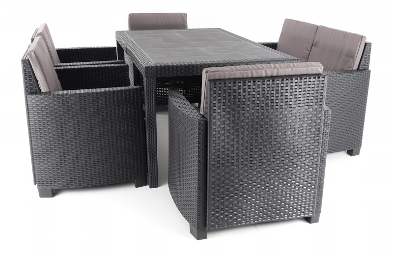 Stolová sestava se skládá ze 6 pohodlných křesel a stolu vimitaci umělého ratanu s UV filtrem.