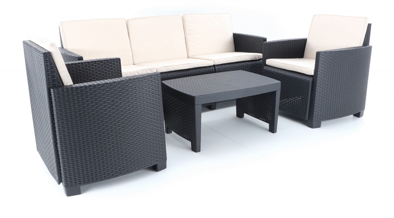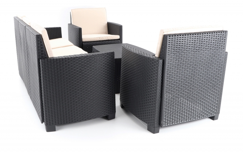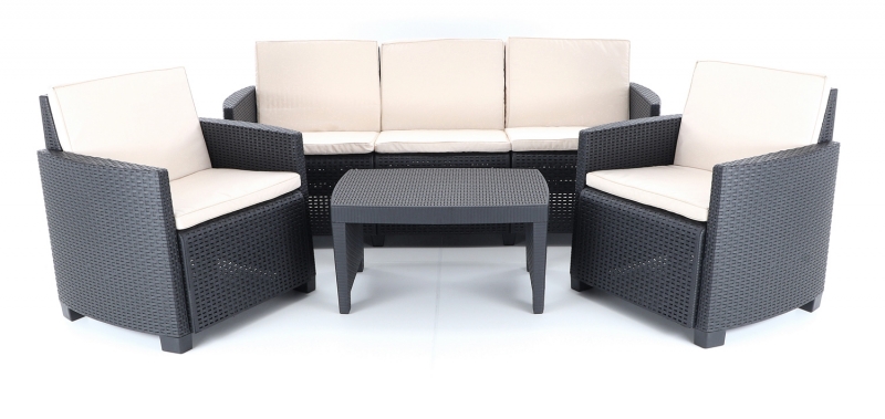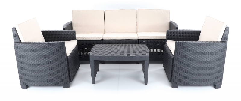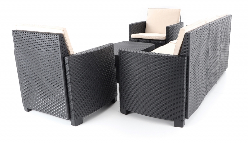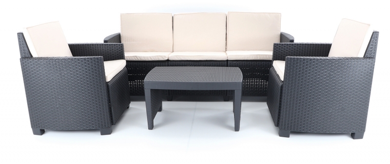 Stolová sestava se skládá ze 2 pohodlných křesel, třímístné lavice a stolku vimitaci umělého ratanu s UV filtrem.