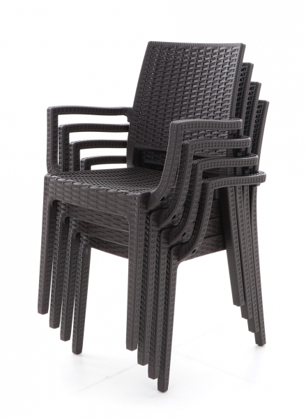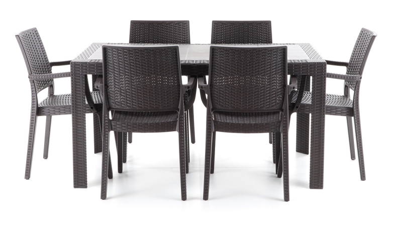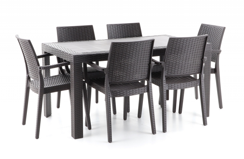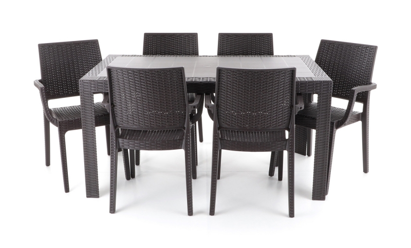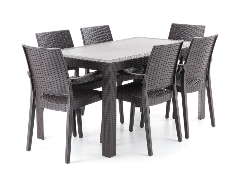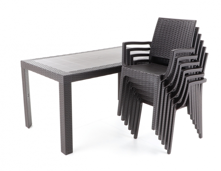 Stolová sestava se skládá z 6-ti pohodlných masivně vyztužených křesel v imitaci umělého ratanu s UV filtrem.