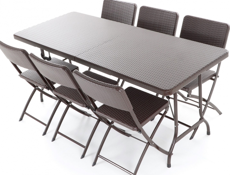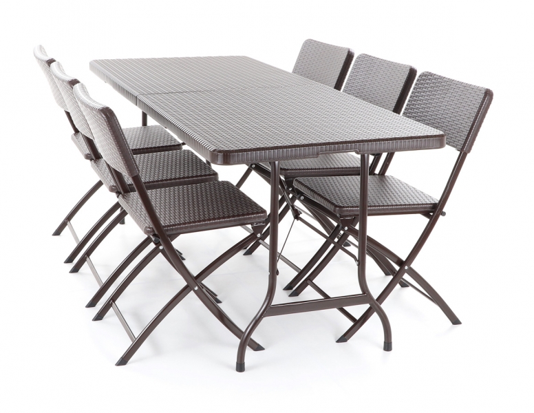 Stolová sestava 6-ti skládacích židlí z ocelových profilů povrchově dokončena komaxitovou barvou, čalounění je v imitaci umělého ratanu z lisovaného plastu s UV filtrem, určená do interiérů, exteriérů a pergolových prostor • Stůl je zhotoven z ocelových profilů povrchově dokončena komaxitovou barvou, deska stolu je v imitaci umělého ratanu z lisovaného plastu s UV filtrem