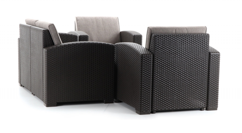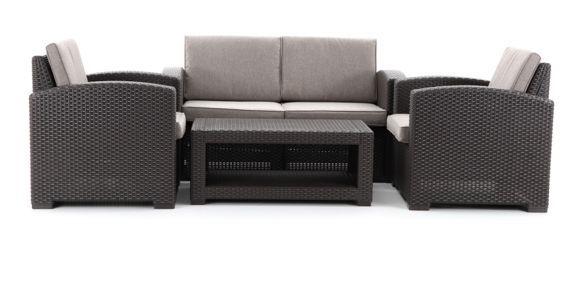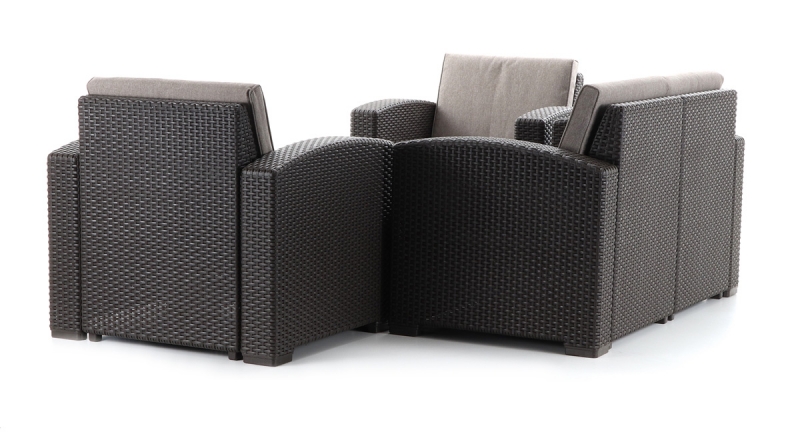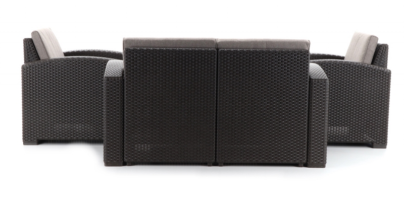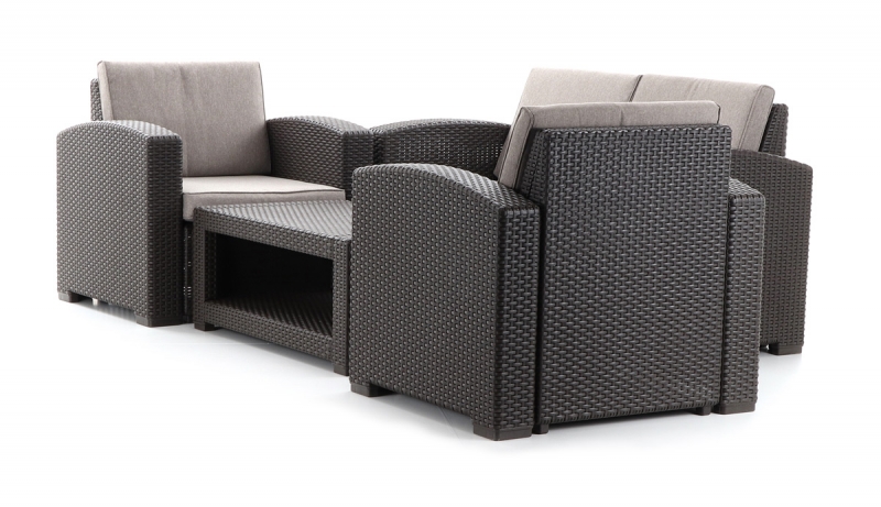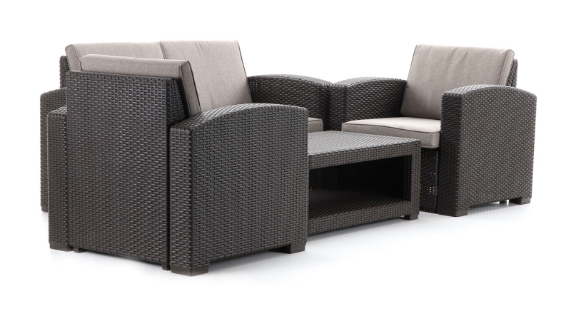 Nábytek má originální povrchovou strukturu napodobující přírodní ratan. Ideální pro pohodlné venkovní posezení na vaší zahradě či terase.