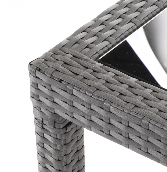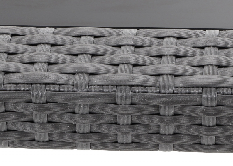 Čalounění je z umělého ratanu. Stolová deska je z tvrzeného skla, podnoží opleteno umělým ratanem. .