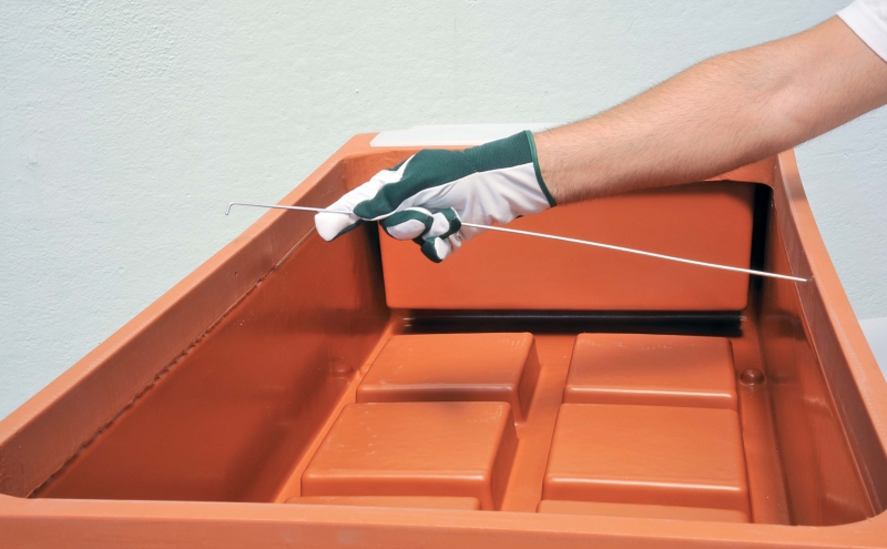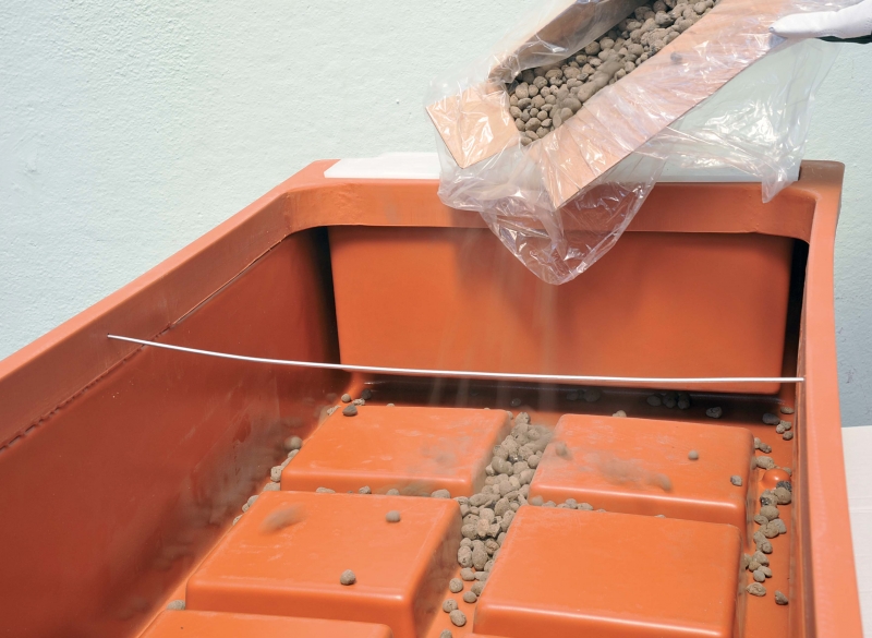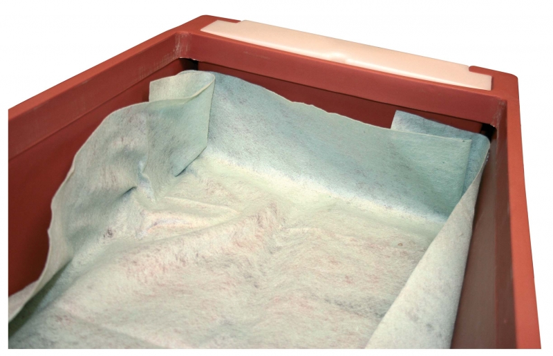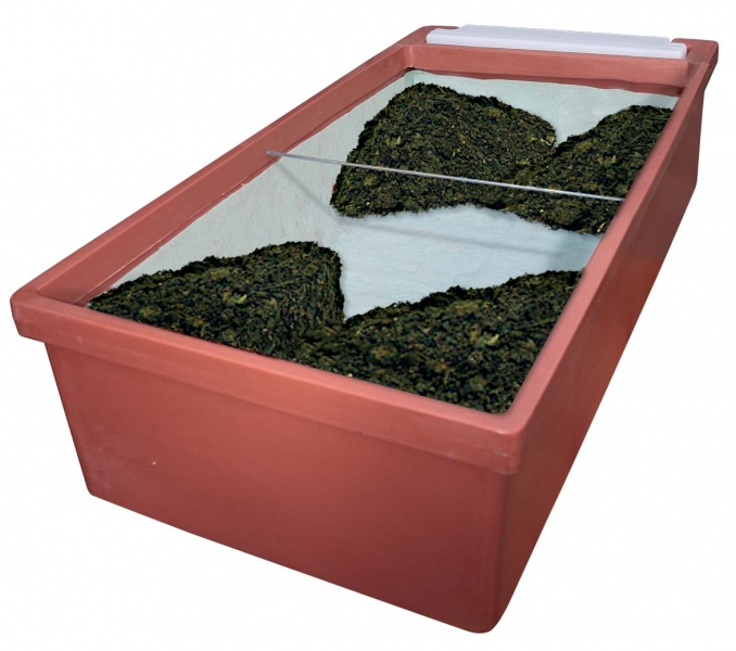 Samozavlažovací truhlík pro městskou zahradu - součástí je 6litrová nádrž na vodu s kohoutkem, kapilární netkaná textilie o rozměrech 80 x 130 cm a pytel expandované hlíny. Truhlík může obsahovat až 100 litrů zeminy.