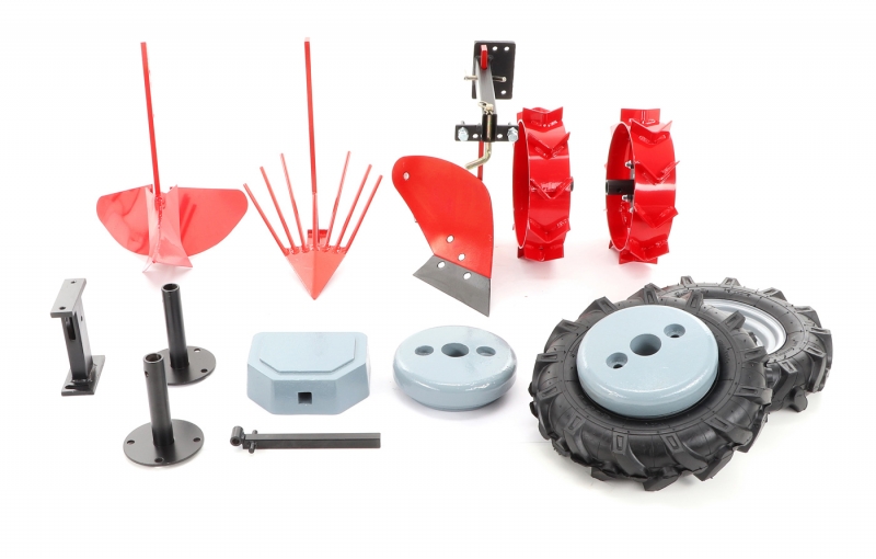 - Kompletní velký KIT (šípová kola 400x8 včetně nábojů, kovová kola včetně nábojů, KIT závaží - kolové i přední protizávaží, jednostranný pluh, vyorávač brambor, hrobkovač, závaží a adaptery)
