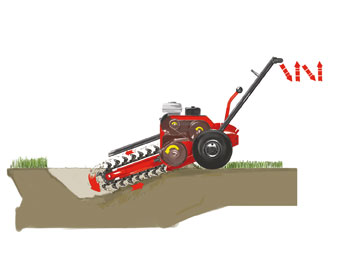 Fréza nabízí šířku záběru 102 mm a nastavitelné hloubky záběru na 100, 200 nebo 305 mm, což umožňuje přizpůsobení práce konkrétním požadavkům. Pracovní naklonění až 59 stupňů zajišťuje snadné použití i na nerovných nebo šikmých plochách.